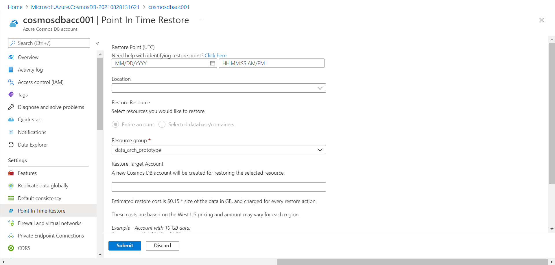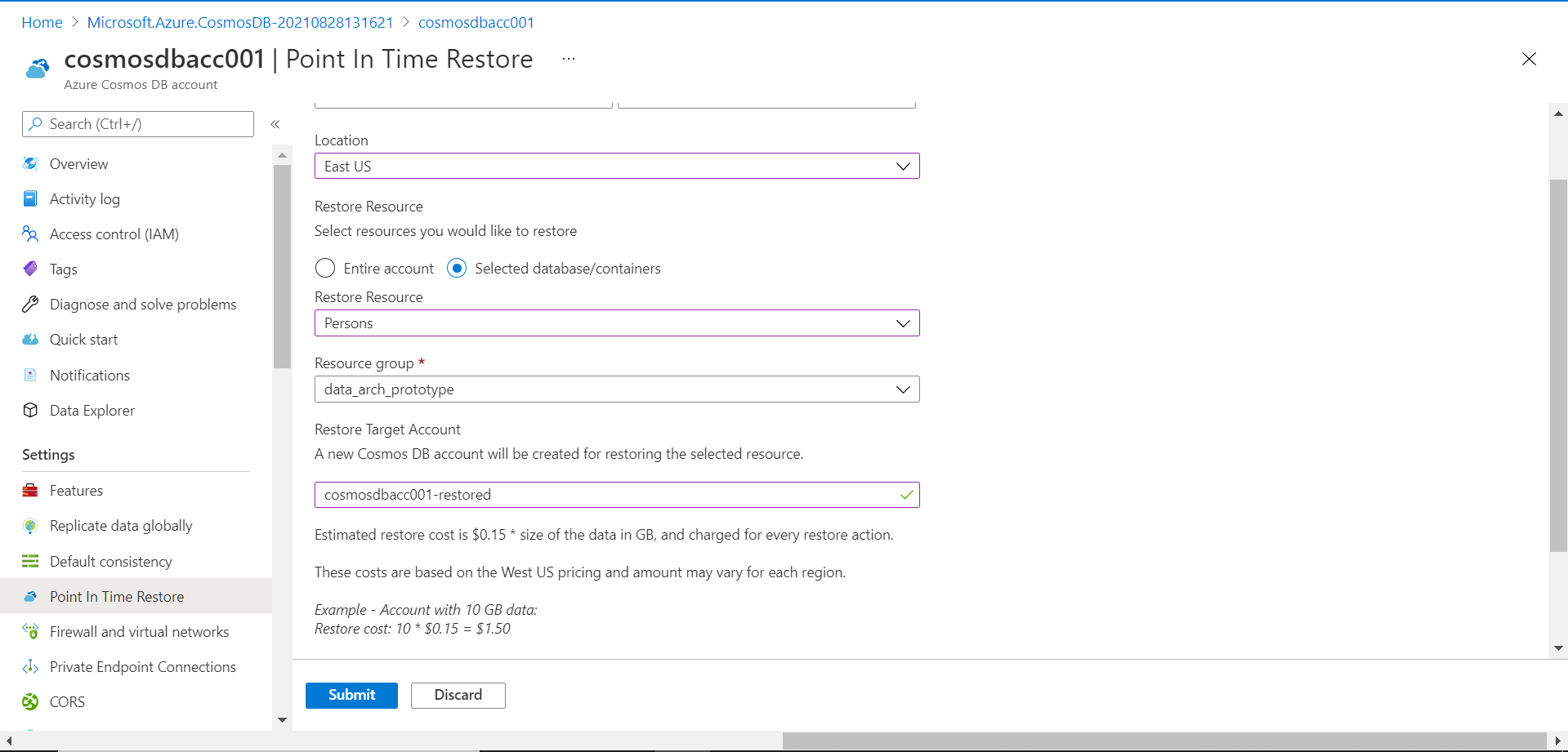 Provide a new name for the target restore account that would be created, and then click on the Submit button. This would start the point-in-time restore process. It can take a few minutes for the new account to get restored.