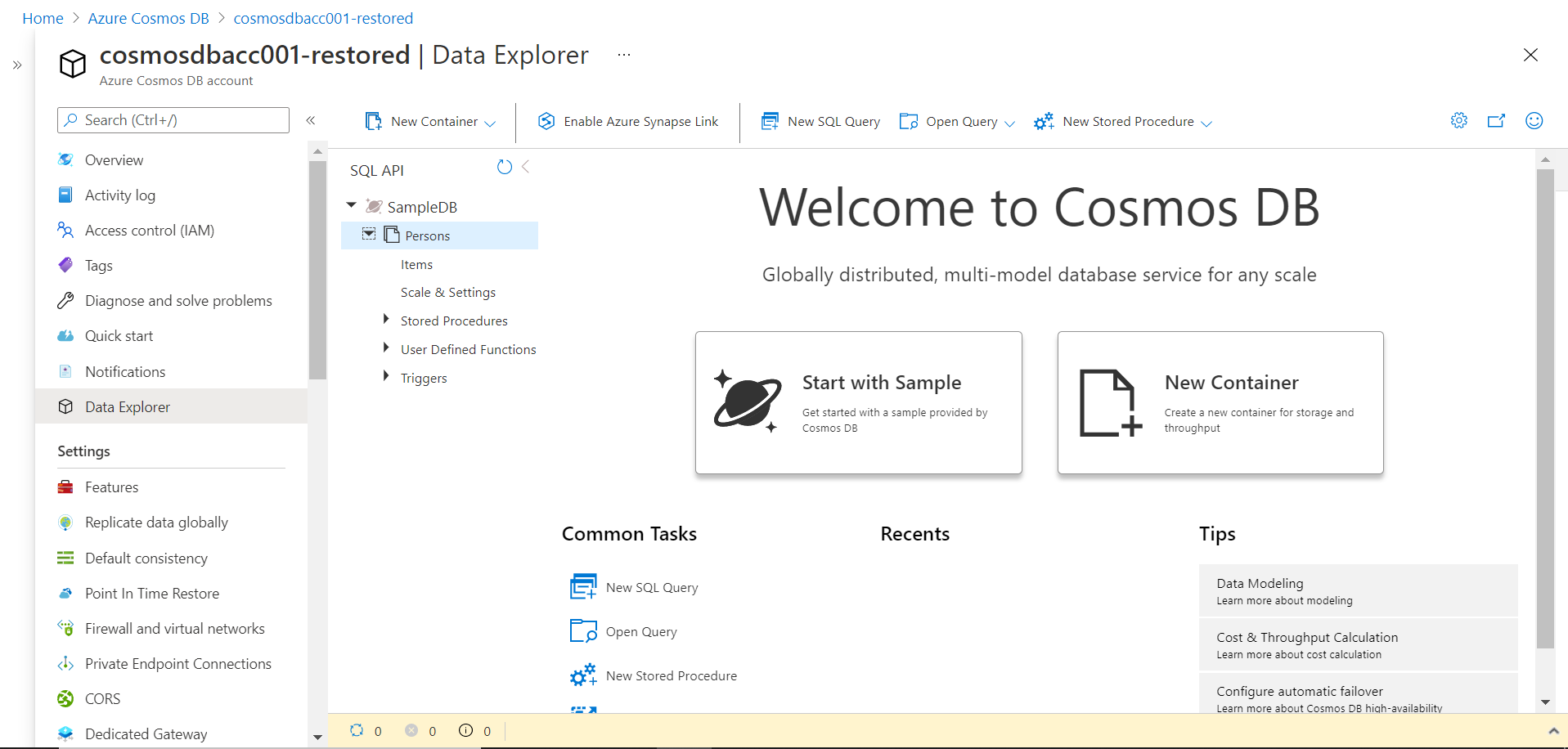 Once the new account is created, you would be able to explore the data and find that the deleted container is restored in the same database, but in a new account. The data won’t be restored in the existing account.