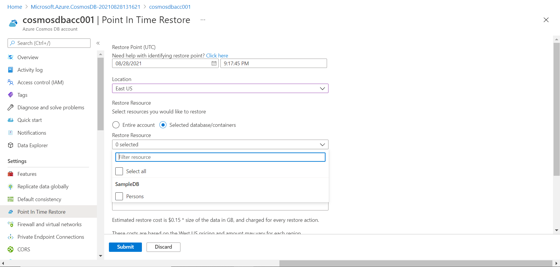 Navigate back to point in time restore options and select the event where it shows 1 second after the container got created. This will select the exact time of the restore point. Now, we need to select the location in which the newly restored account would be created. Then we need to select the database or containers that we need to restore. We are interested in restoring the container, so we will select the Persons container from the Sample DB database.