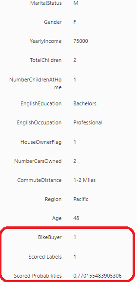 In the above screen, Bike Buyer is the actual value whereas scored labels are the predicted value with probability.