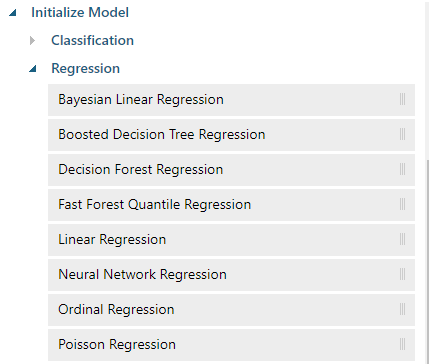 The regression technique is used to forecast by estimating values. There are different regression techniques available in Azure machine learning that supports various data reduction techniques as shown in the following screen.