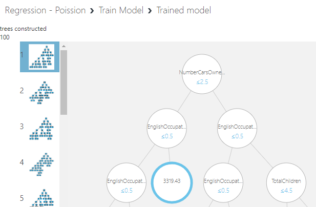 As configured in the tress model 100 trees are built. You can limit the number of trees to attain higher accuracy. According to this tree, the number of cars is the most important parameter to define the yearly income and next is the Occupation and so on.