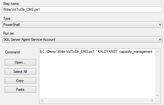 In my case I have created a SQL Server Agent job that uses the PowerShell scripts Write-DbSpaceToDb_CMS.ps1 and Write-VolToDb_CMS.ps1; The two parameters that are required are names of the destination server and database capacity_management where we will store the information.
