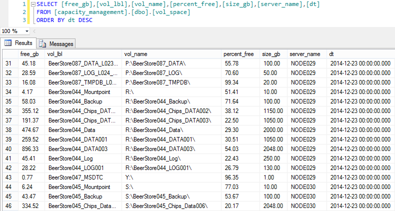First of all let us check what type of information I have collected in my capacity_management.dbo.vol_space table.
