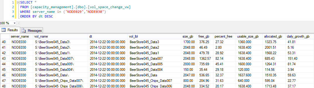 Now that we have this let us check what the view capacity_management.dbo.vol_space_change_vw is storing