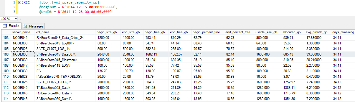 Now we have information about what was the total size and the used space of the volumes the in the first date (@beginDT), what are they at the current moment (@endDT). The stored procedure is able to calculate the average grow for each volume in our case; This is column avg_growth_gb; Once we have this information we are able to get the available space for the volume and divide it to the average grow per day resulting in the ‘days to live’ metric. In our case for disk S:\BeerStore045_Data007\ if the data on the disk continues to grow with the same rate it will take 34.11 days to fill it up.