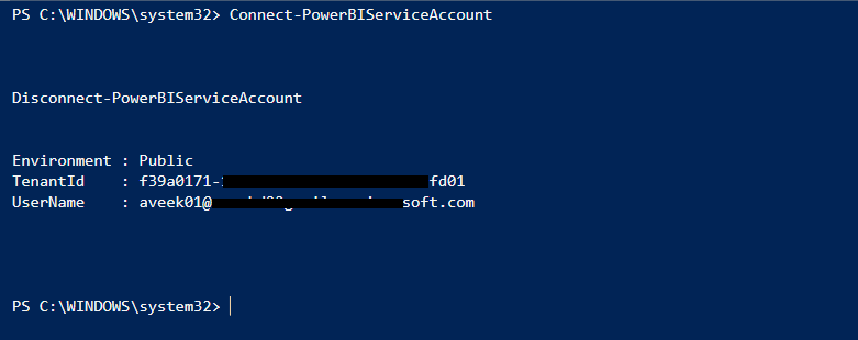 Once the login is validated, the PowerShell console will be displayed the TenantID and the login Email of the Power BI Service account to which you are logged in. If you get this, then the login has been successful.