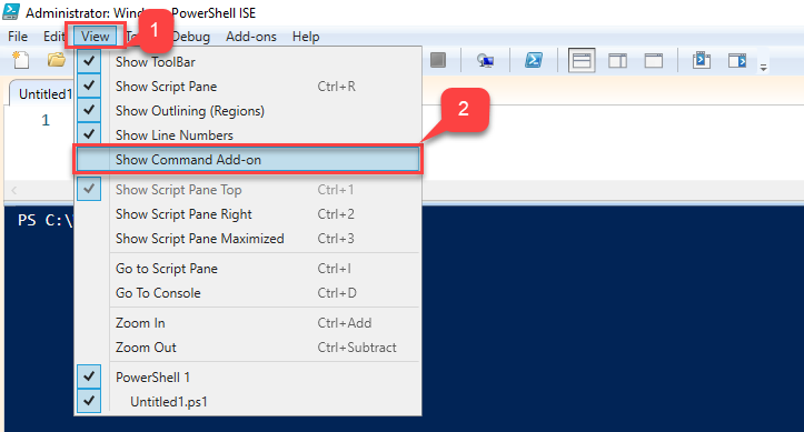 Once the PowerShell ISE is up and running, we will now install the Power BI PowerShell Management module. Head over to View in the Menu Bar and then select Show Command Add-on. A new window will appear in the right-hand pane where you can see the available commands that can be used with the PowerShell environment.