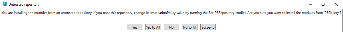 In the textbox for Name, enter “MicrosoftPowerBIMgmt” and hit the Run button. You might receive a warning which states that the installation of the module is from an untrusted repository and if you would like to continue. You can go ahead and click Yes.