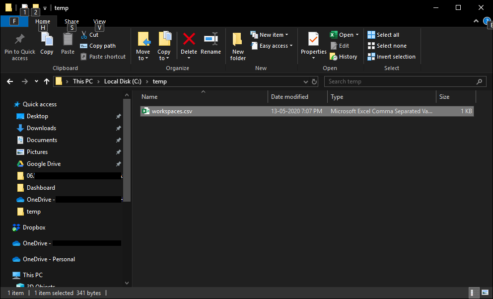 Once the command is executed, a new file will be created under the “temp” directory with the name “workspaces.csv“.