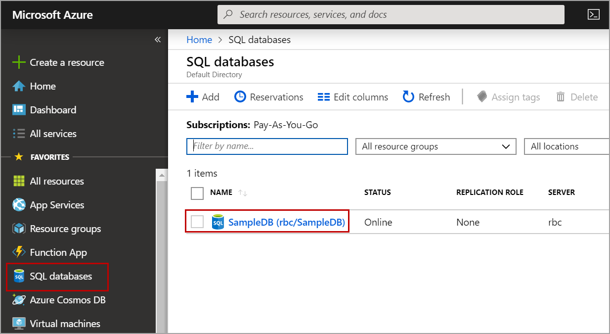 Log in to the Azure portal and navigate to SQL databases. Click on the database.