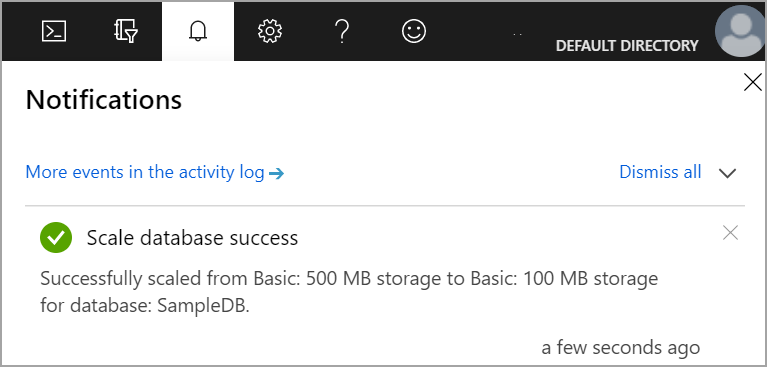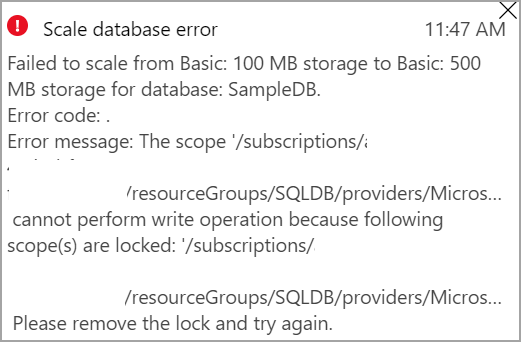 Let us try updating the configuration of the database when the database has a ‘Read-only’ lock. I am scaling the database from Basic 100 MB storage to Basic 50 MB storage. The scaling operation failed with an error as shown in the below image.