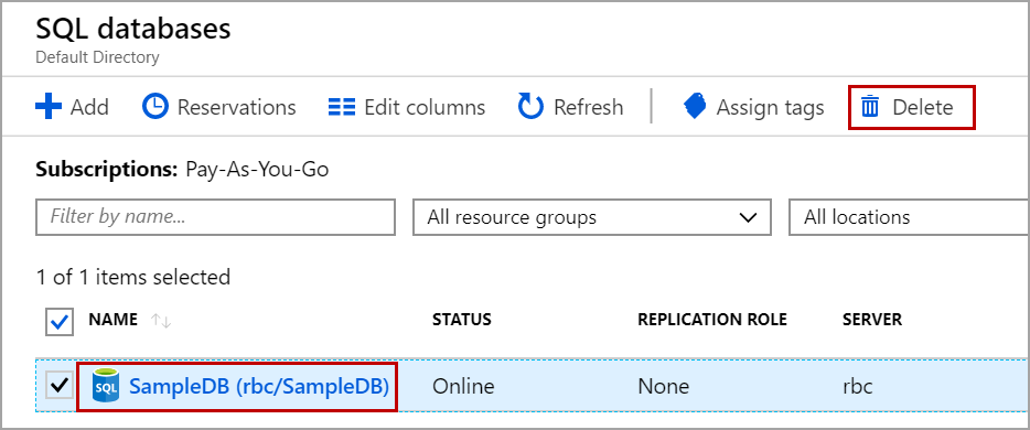 Now let us try deleting the database. Navigate to the SQL database page. Select the database on which you created the Delete lock and click on the Delete button.