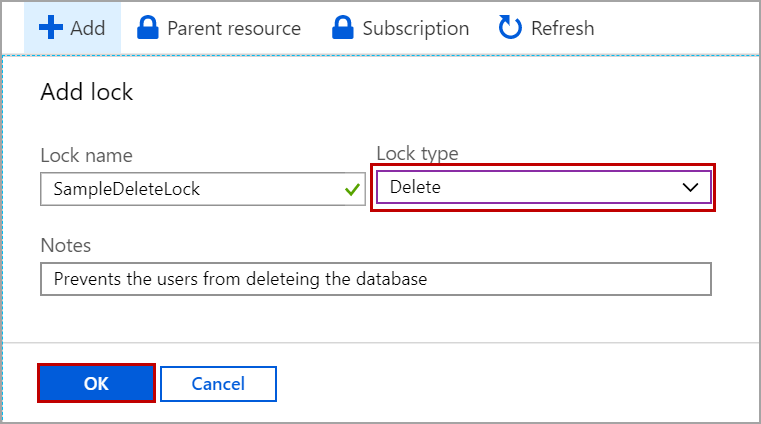 Enter the name of the Lock. In this case, I want to protect the database from accidental deletes. So, I selected the Lock type as Delete. Enter the notes or you can leave it blank and click on OK.