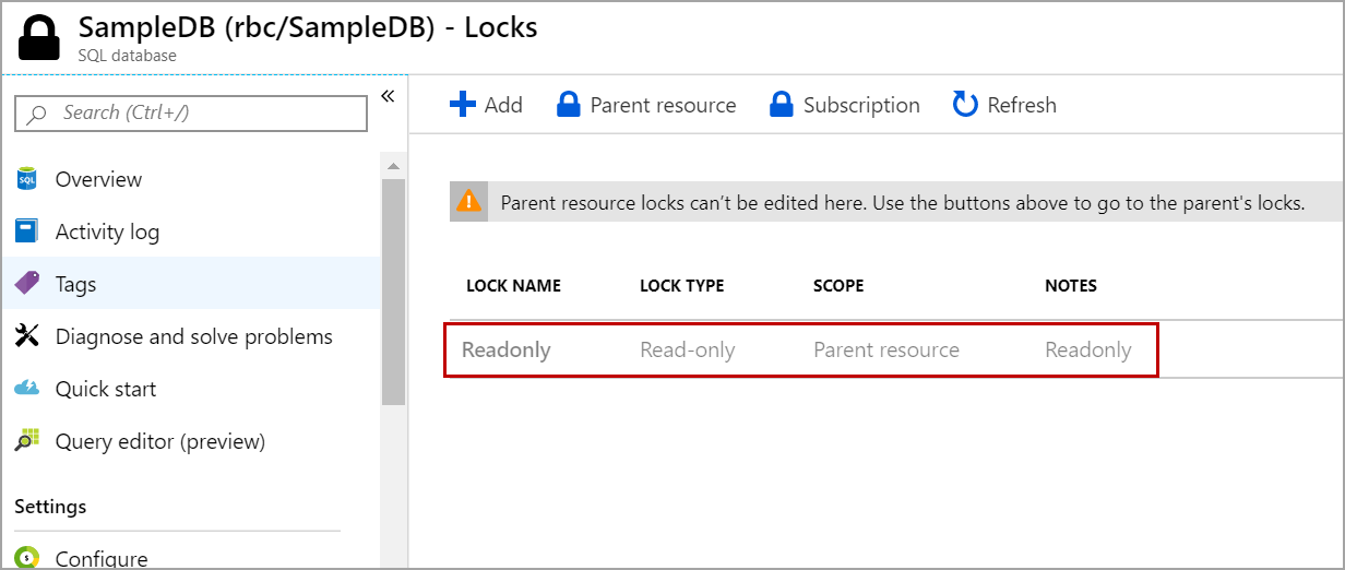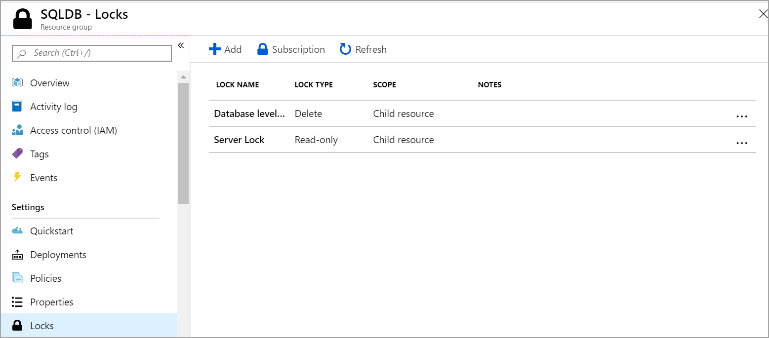 Locks placed at parent resources are inherited to newly created child resources. For example, if we place a delete lock on the Azure SQL server and if add a new Azure SQL database on the same server, the newly created database will also inherit the delete lock.