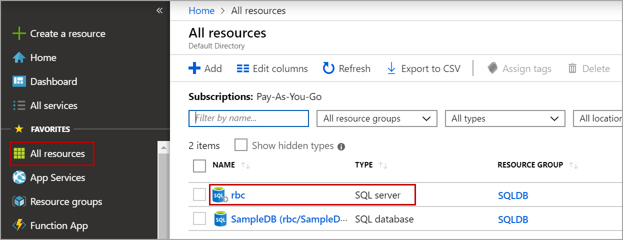 We can also create locks at Azure SQL server level. To create locks on the Azure SQL server, navigate to the All Resources page and click on the Azure SQL server.