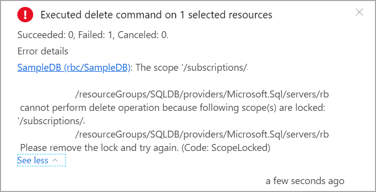Deleting the Azure SQL database with read-only lock: I tried deleting the Azure SQL database that has only one lock i.e. Read-only. The delete operation failed with an error as shown in the below image.