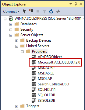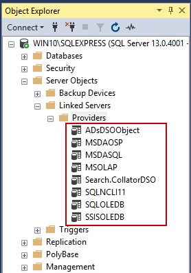 A list of all currently available providers in SQL Server can be seen under the Providers folder: