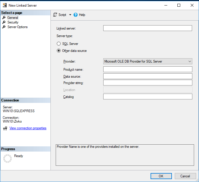This will open the New Linked Server dialog: