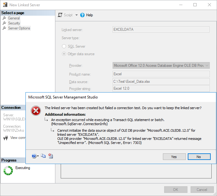 Cannot initialize the data source object of OLE DB provider “Microsoft.ACE.OLEDB.12.0” for linked server “EXCELDATA”. (Microsoft SQL Server, Error: 7303)