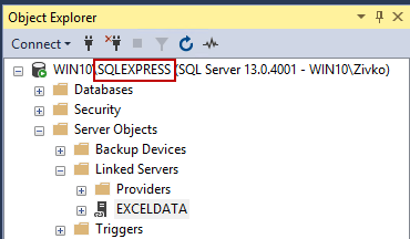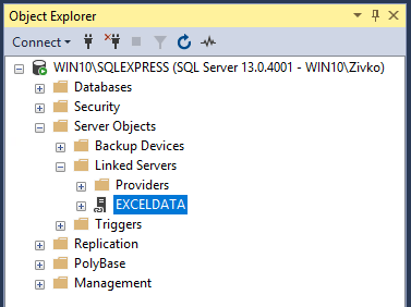 Press Yes to create the EXCELDATA linked server. The EXCELDATA linked server will appear under the Linked Server folder: