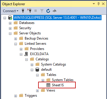 Now, when expanding the Tables folder, the Excel sheets will appear. Note that every sheet is shown as SQL Server table with a dollar sign ($) at the end:
