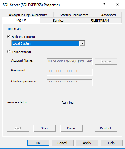 On the SQL Server Properties dialog under the Log on cart, choose the Built-in account radio button and from the combo box, select the Local System item: