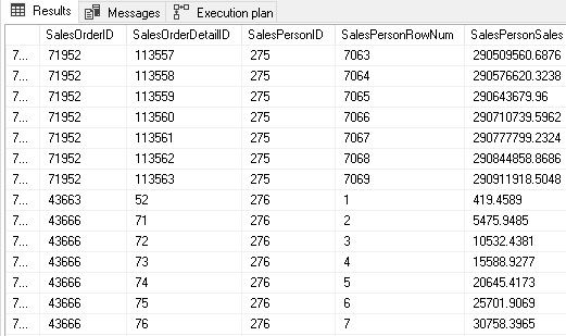 SELECT SalesOrderHeader.SalesOrderID, SalesOrderDetail.SalesOrderDetailID, SalesOrderHeader.SalesPersonID, ROW_NUMBER() OVER (PARTITION BY SalesOrderHeader.SalesPersonID ORDER BY SalesOrderDetail.SalesOrderDetailID ASC) AS SalesPersonRowNum, SUM(SalesOrderHeader.SubTotal) OVER (PARTITION BY SalesOrderHeader.SalesPersonID ORDER BY SalesOrderDetail.SalesOrderDetailID ASC) AS SalesPersonSales FROM Sales.SalesOrderHeader INNER JOIN Sales.SalesOrderDetail ON SalesOrderDetail.SalesOrderID = SalesOrderHeader.SalesOrderID WHERE SalesOrderHeader.SalesPersonID IS NOT NULL AND SalesOrderHeader.Status = 5; |