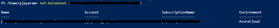 PS:/home/pjayaram> Set-AzContext <subscriptionID> |