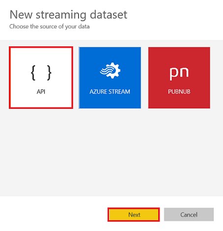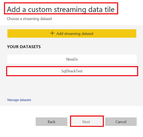 In this Add a custom streaming data tile page, we will choose our streaming dataset which we created at the beginning of demo and then click Next.