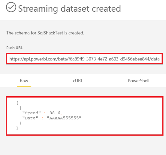 When we click Create button, Power BI generates Push URL. We will use this URL to push stream dataset.