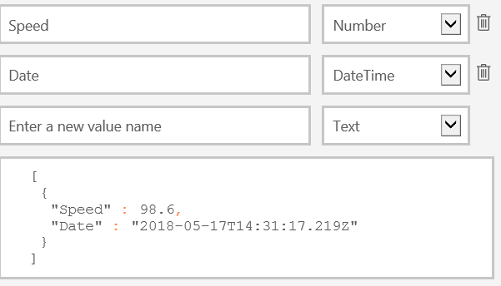 [ { "Speed":18, "Date":"2018-05-17T09:15:02.565Z" } ] |