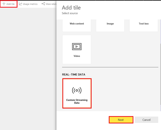 We will click + Add tile and then select REAL-TIME DATA (Custom Streaming Data), click Next