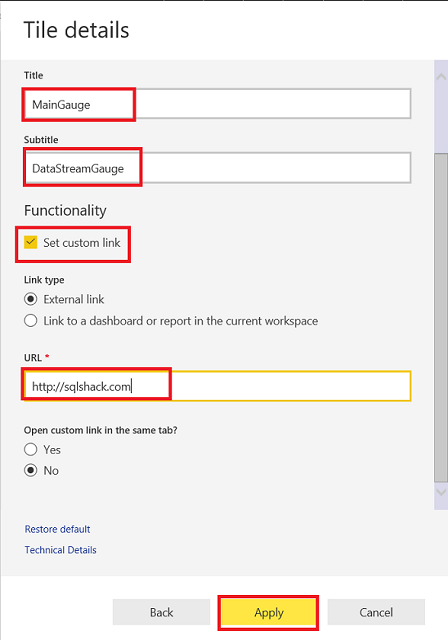 In Tile details page we will set the gauge Title and Subtitle. At the same time, we can enable Set Custom Link. This option is offered when we click gauge so it can redirect any link. We will click Apply.