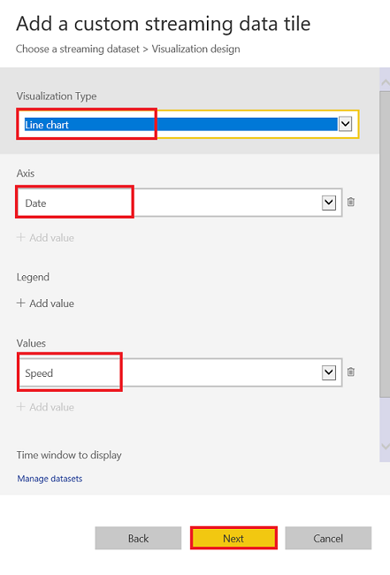 Now, we will add line chart. In Add a custom streaming data tile page chose Line chart. In the Axis field select Date field and in the Values field select speed.
