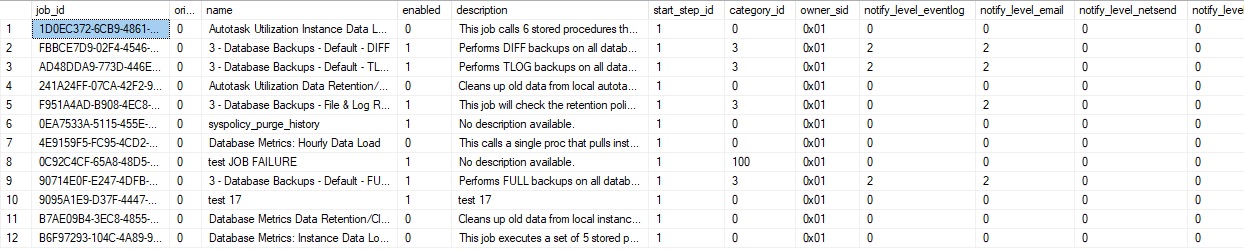 The job_id is a UNIQUEIDENTIFIER that ensures a unique primary key for each job. This table also provides the name, description, create/modify dates, and a variety of other useful information about the job. This table can be queried to determine how many jobs exist on a server or to search based on a specific string in job names or descriptions. We could also search based on owner_sid to determine if any jobs are owned by the wrong login (such as a departing employee or job creator).