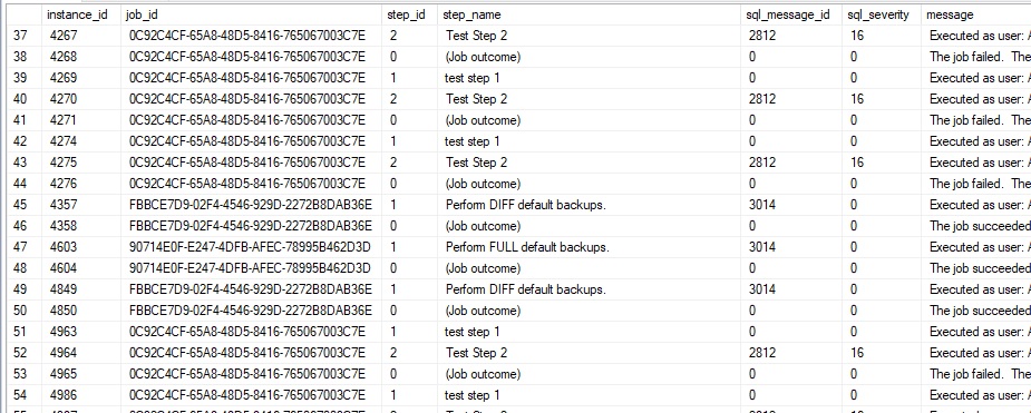 Note that a row with step_id = 0 corresponds to the overall job status, and not that of any one step. It is possible for a job with no steps to fail or a job to fail prior to executing any job steps, therefore we can end up with an overall job status with no corresponding step success/failure details.