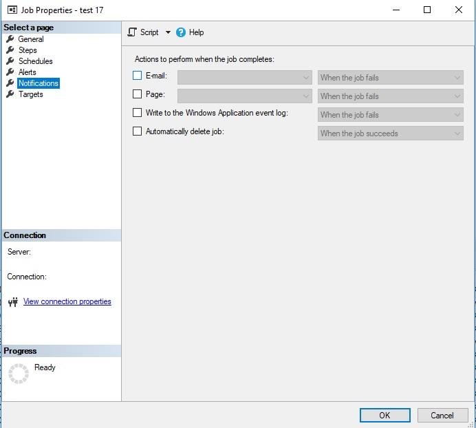 Note that I have included a built-in notification on this job that will email me if it fails. This is intentional and answers the question of, “What notifies us of a failure if the job failure notification process breaks”. The only larger issue than this would be if SQL Server Agent would become unavailable. Alerting on this is beyond the scope of this article, but could be accomplished by a service monitor pointed at SQL Server Agent.