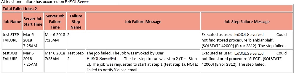 Some effort is taken here to structure the job failure details into a formatted HTML email with the failure count at the top and a table of failure data below. This makes reading the emails relatively easy and straight-forward. The following is an example of a job failure that was sent using this process: