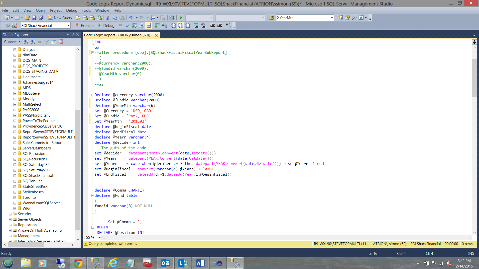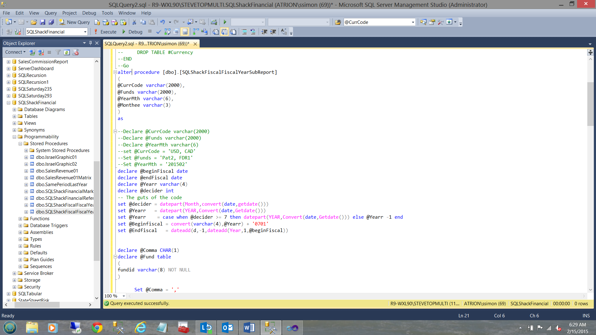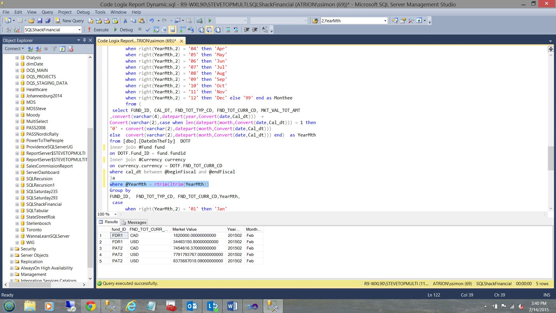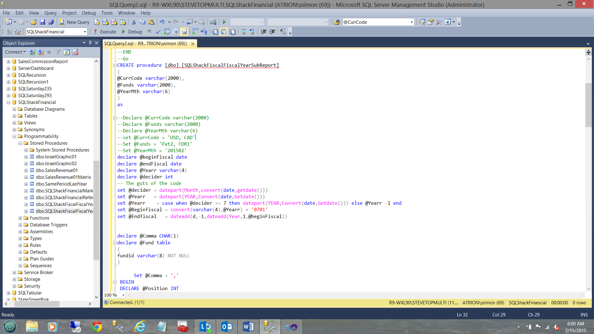The reader will note that we have added the parameter @YearMth to the stored procedure header (see above). Additionally, we have declared a variable @YearMth and set this variable to ‘201502’. This will be commented out once we are ready to create the new stored procedure.