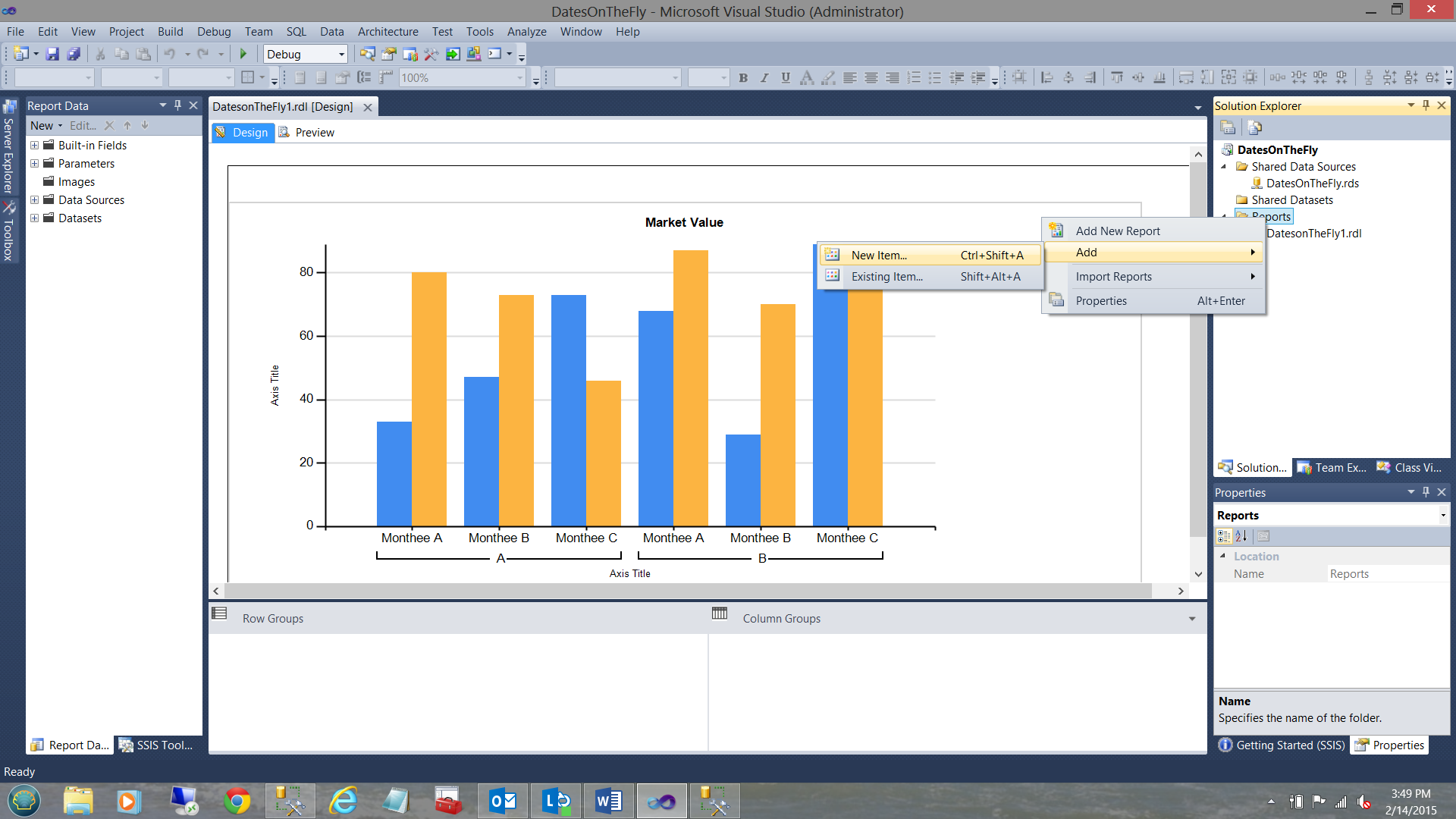 We right click upon the “Reports” folder and select “Add” and “New Item”.