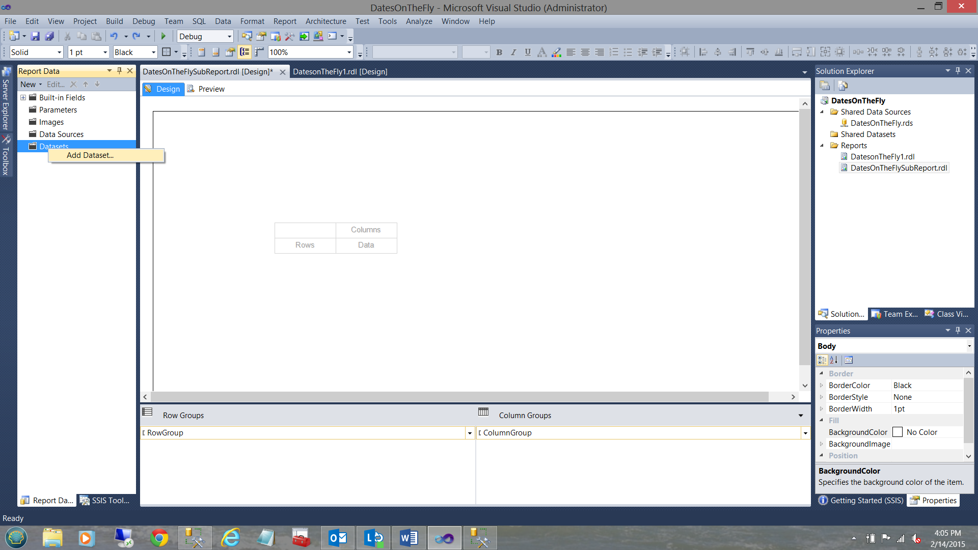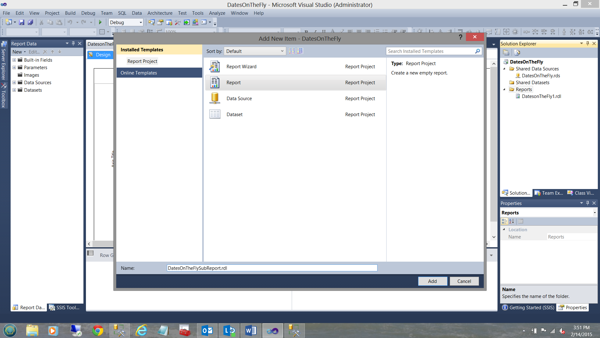 We select “Report” and give our report a name “DatesOnTheFlySubReport”. We click “Add” and we are brought into the “DatesOnTheFlySubReport” subreport drawing surface (see below).