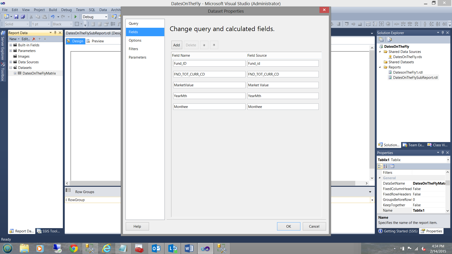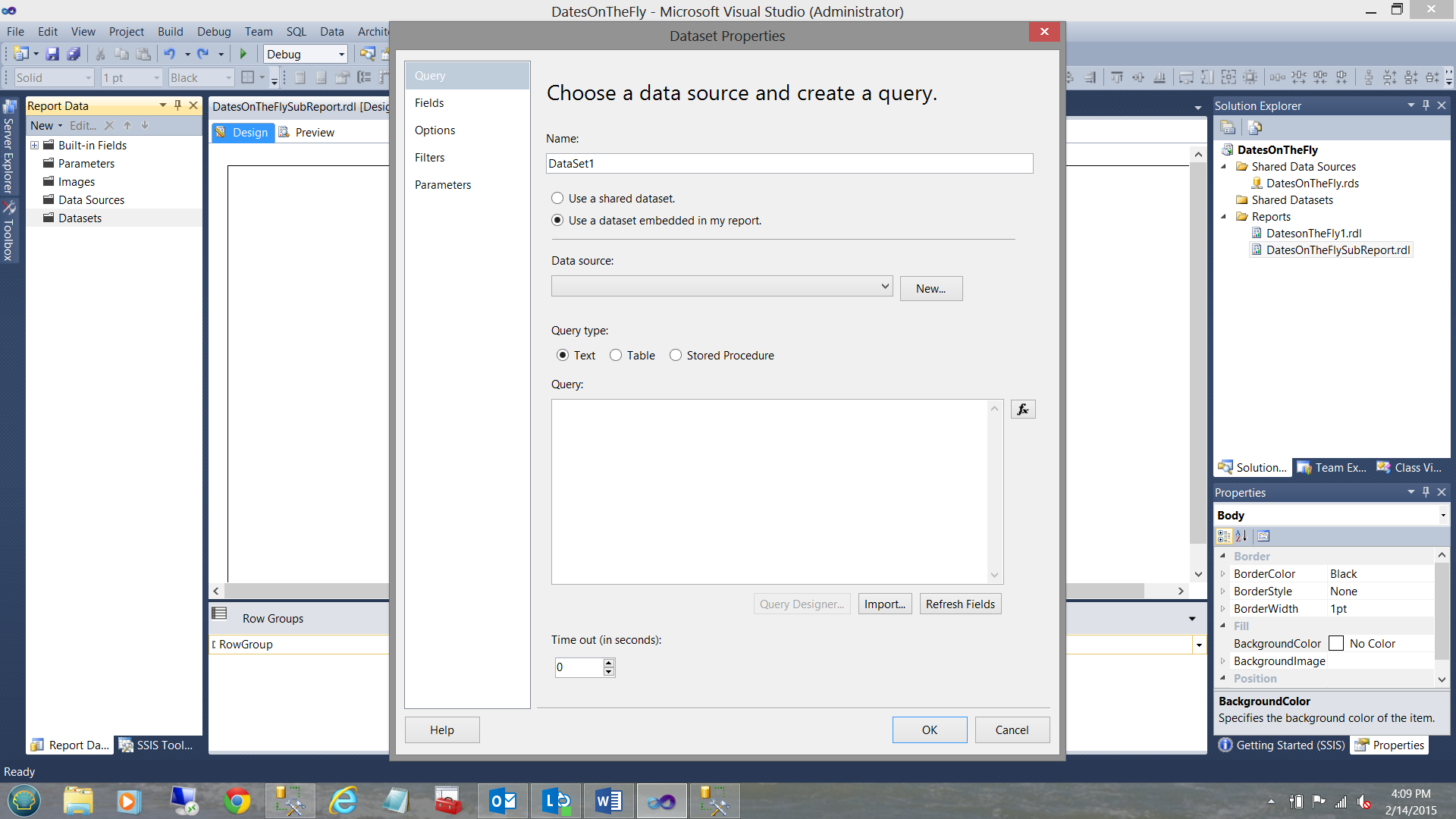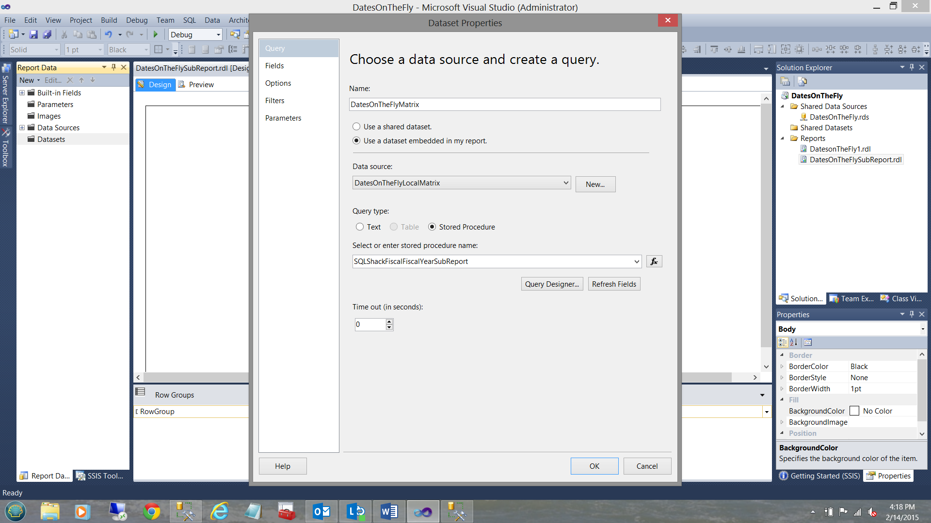 We are brought back to the “Dataset Properties” page. We give our dataset a name “DatesOnTheFlyMatrix”. We also select the “SQLShackFiscalFiscalYearSubReport” stored procedure to pull our data from the table to the report.