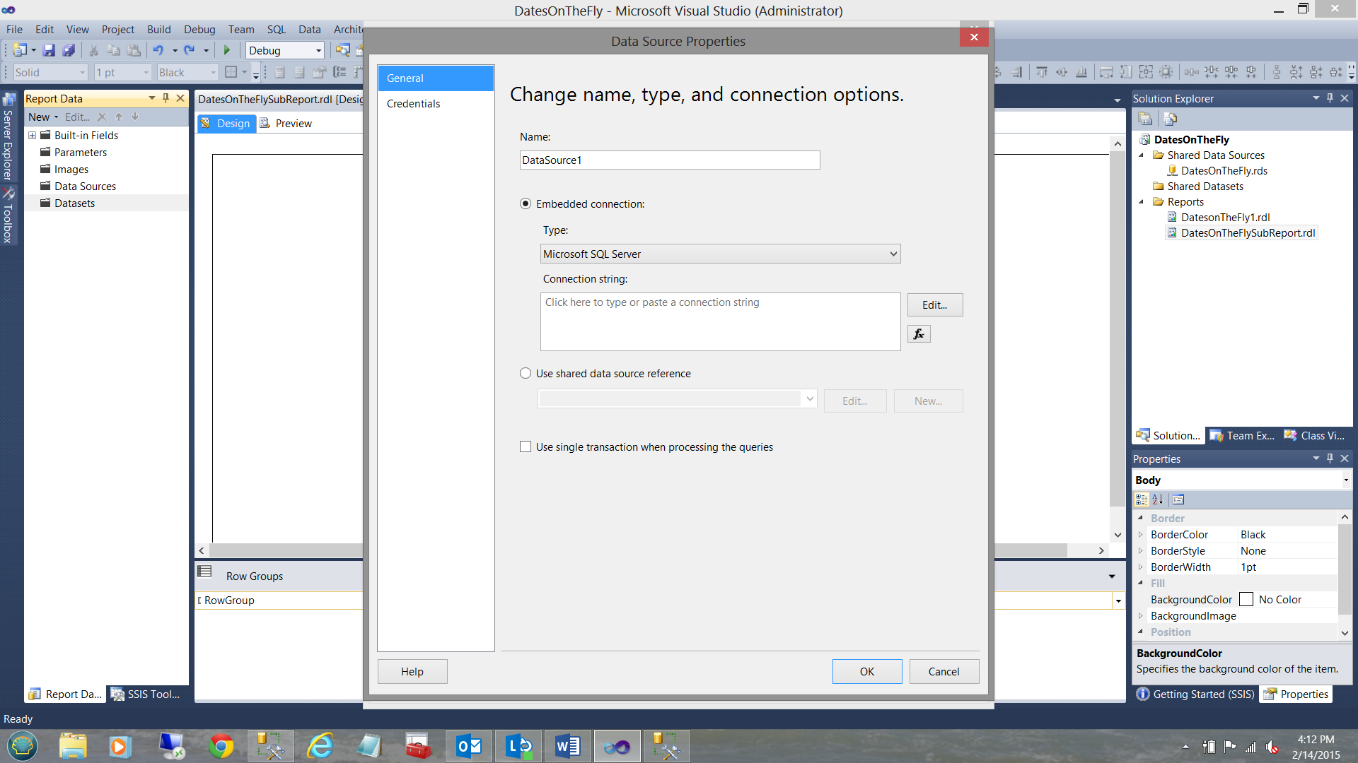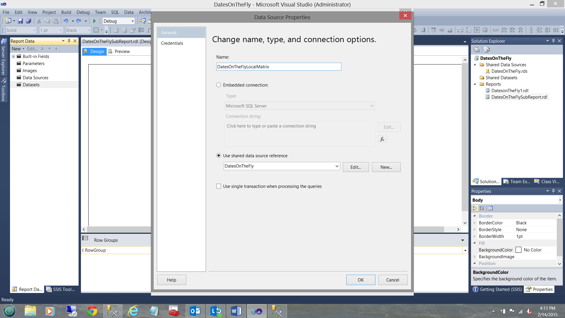We give our local data source a name “DatesOnTheFlyMatrix” and link it to the “DatesOnTheFly” shared data source which was created at our last “get together”. We click OK to create this local data source.