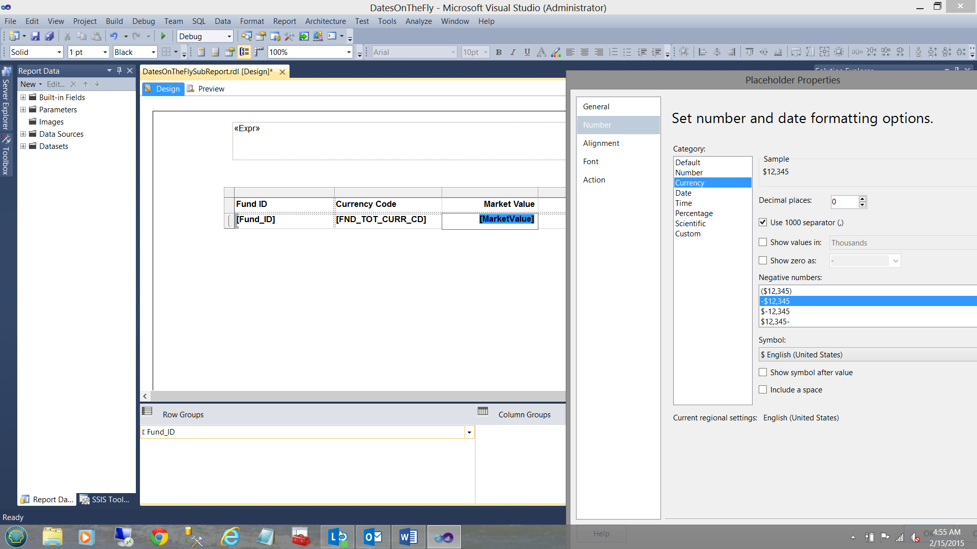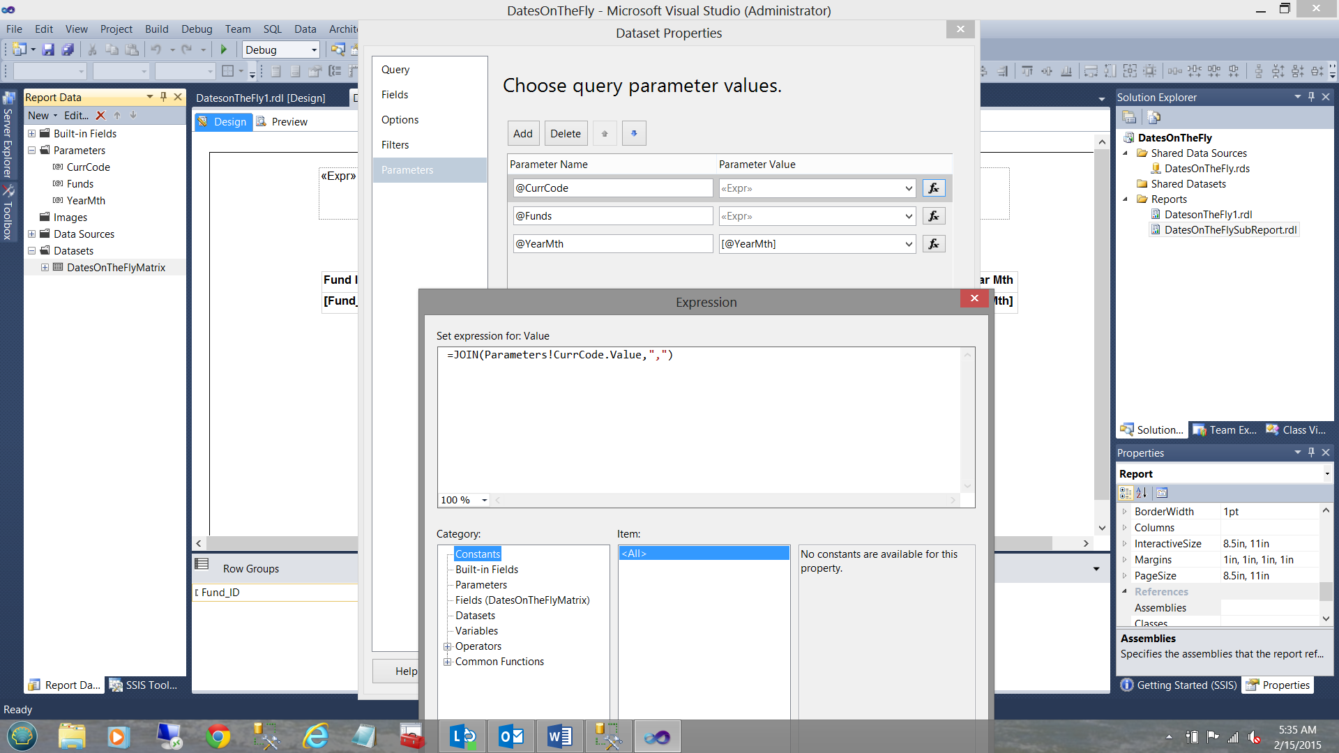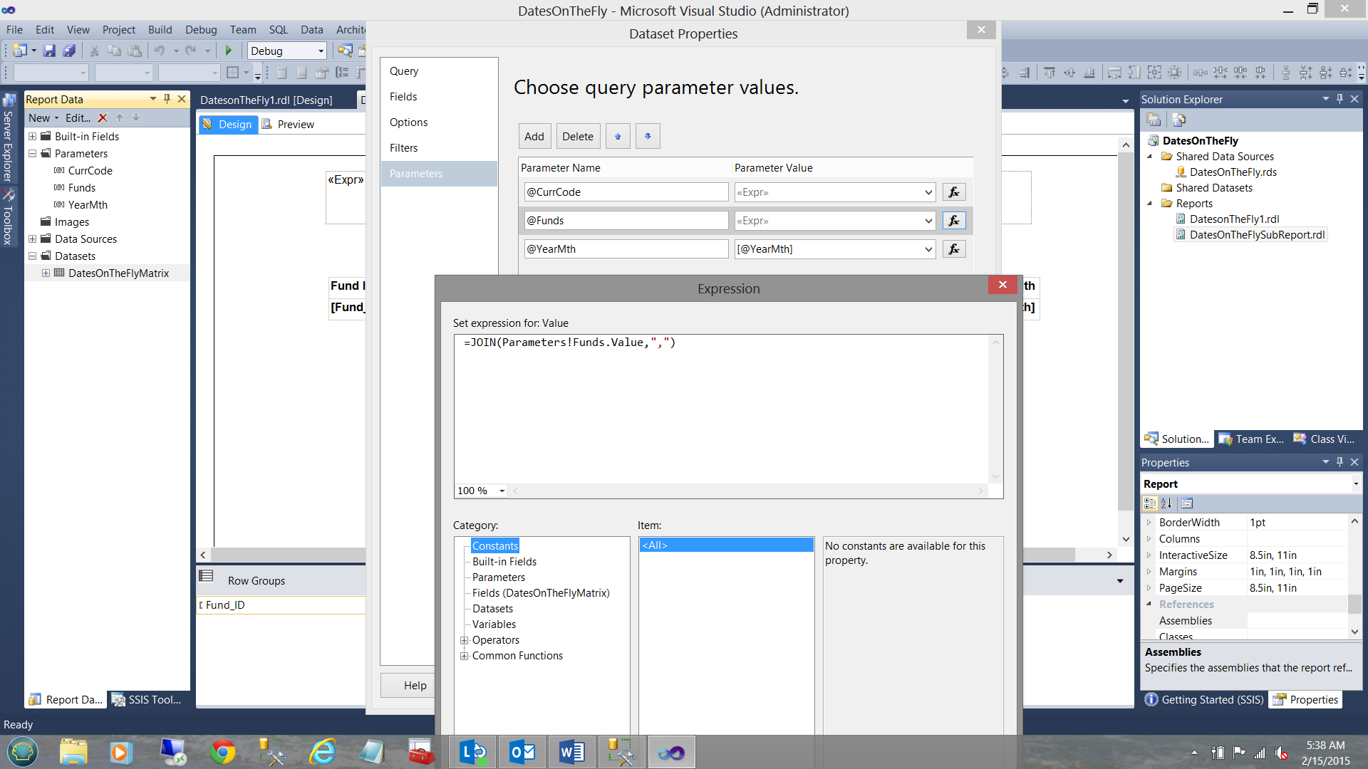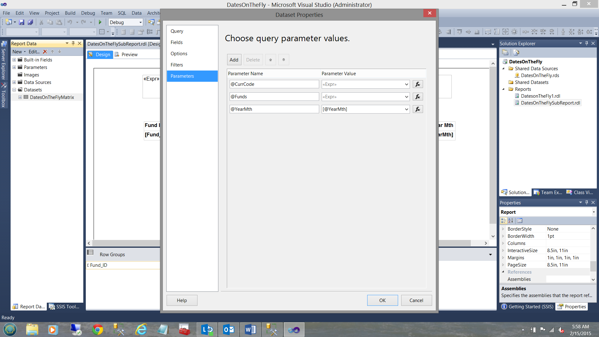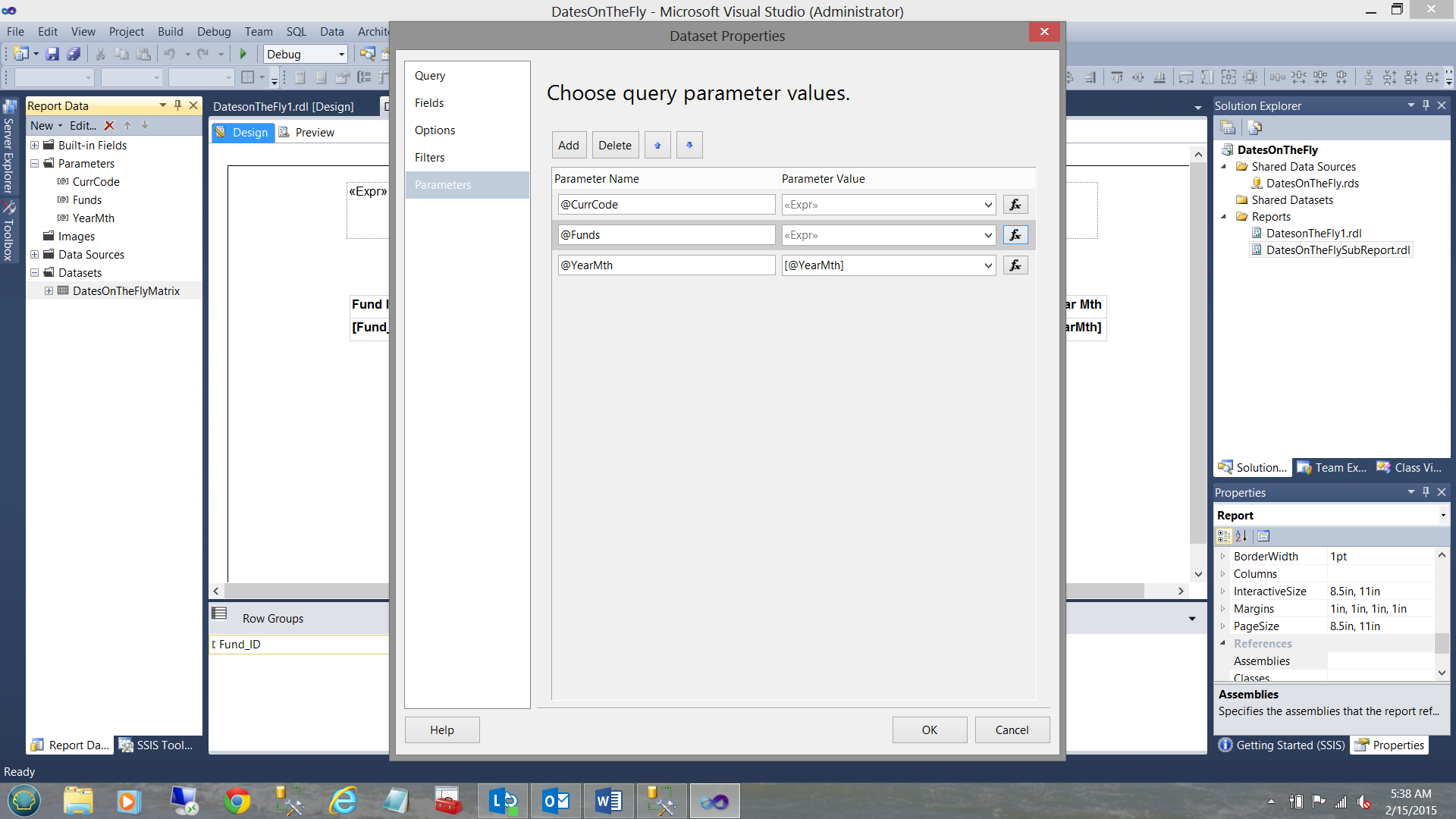 As we recall from our previous discussion, as the currency codes and funds have been configured for multi-select, we cannot utilize the normal “=Parameters!CurrCode.Value” declaration. If we recall correctly, what is passed to the stored procedure is a comma delimited string.