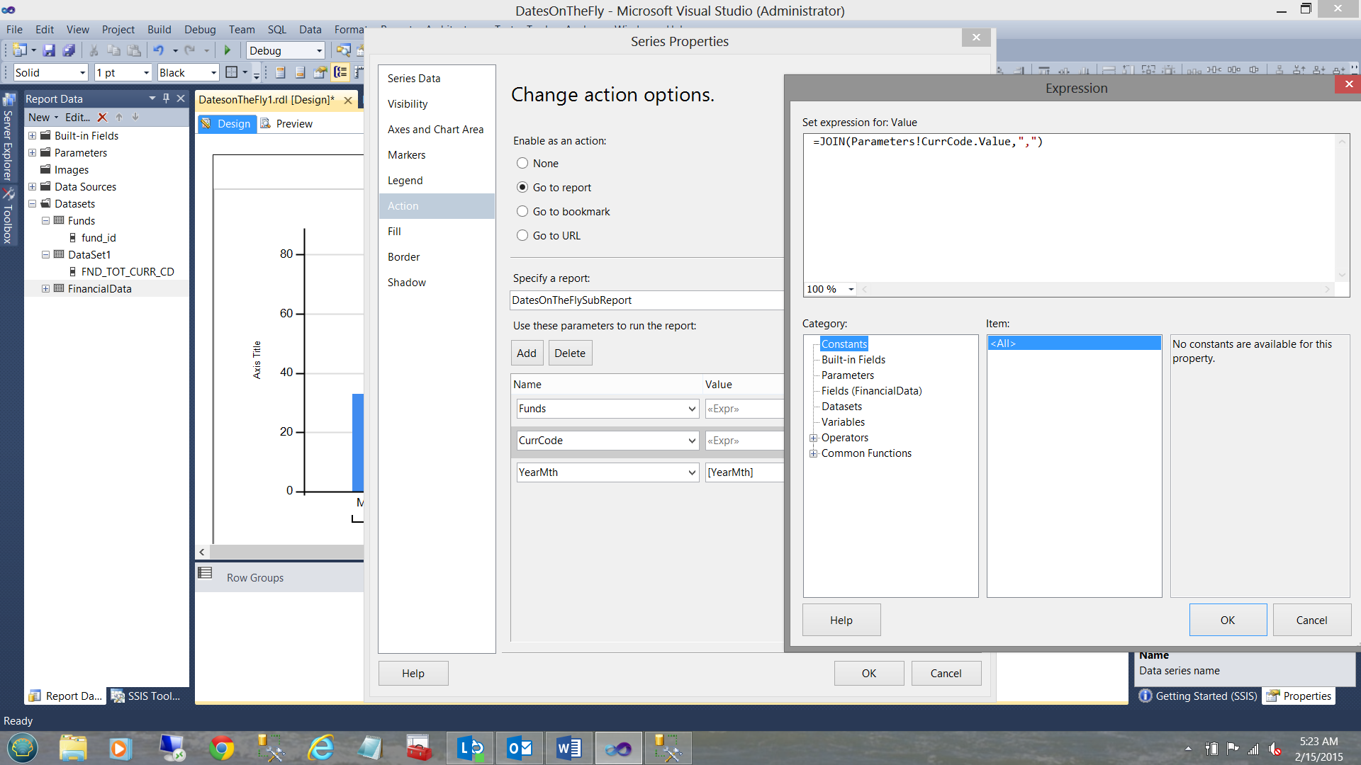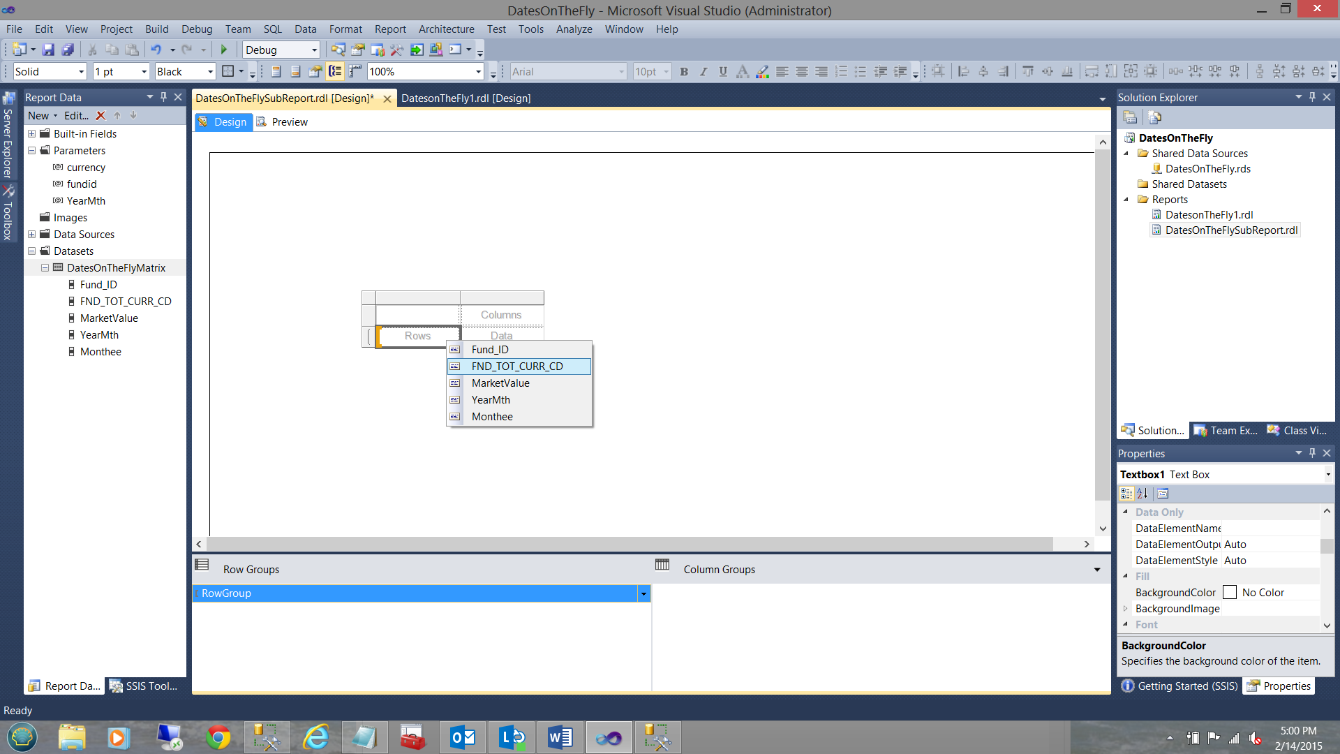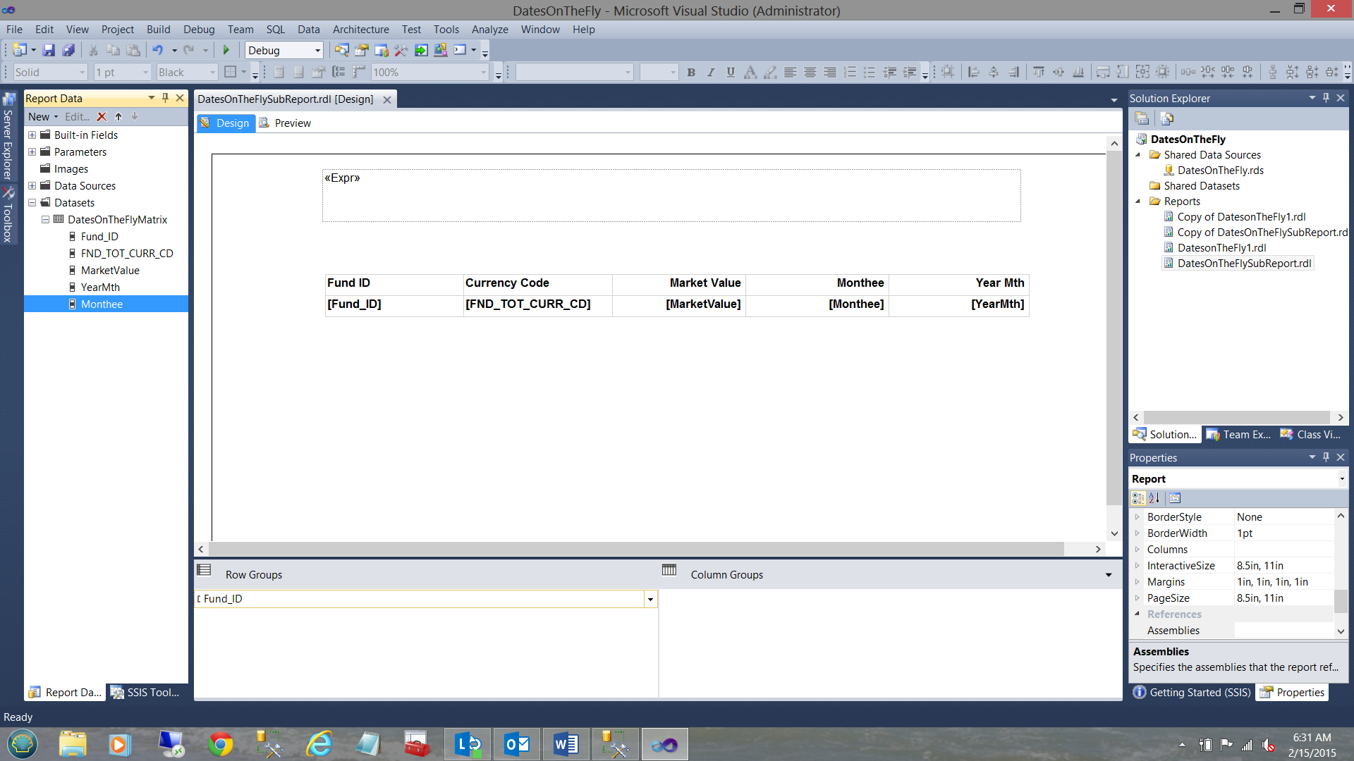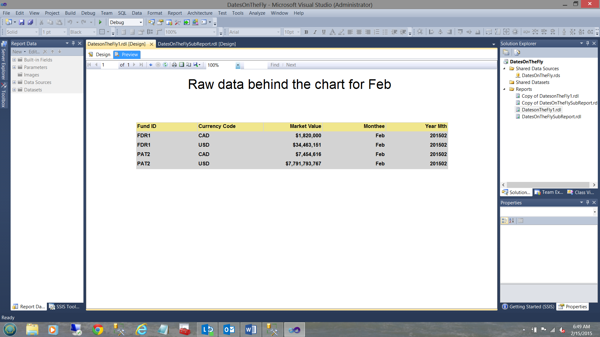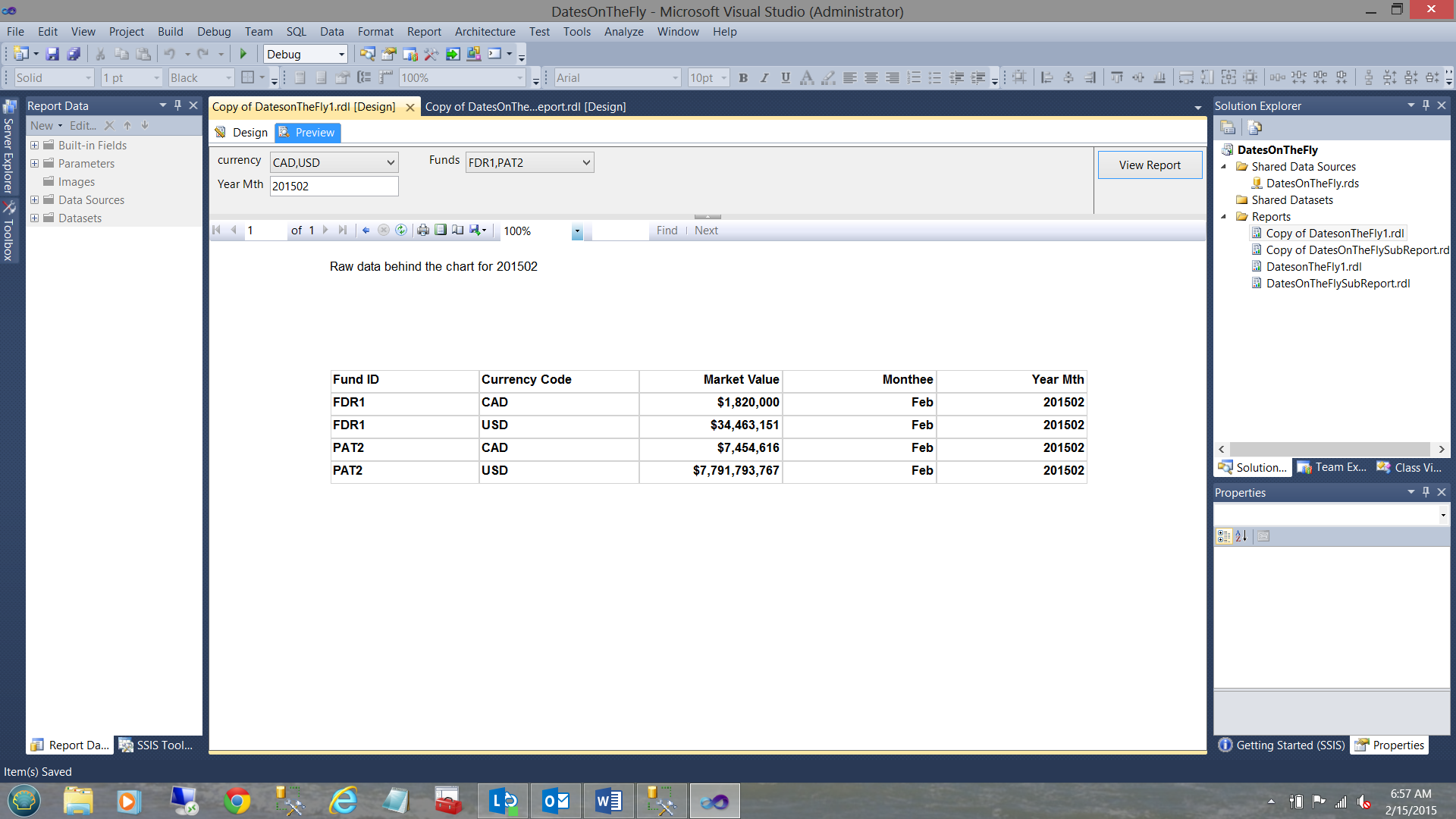 In today’s “get together” we are going to push our application a bit further and build in a subreport which will bring up the underlying data when the end user clicks upon the chart for any particular month. Thus should the user click on February 2015, then all of February’s data (for the selected funds) is shown in a matrix. If the user chooses March, then March’s data is shown.