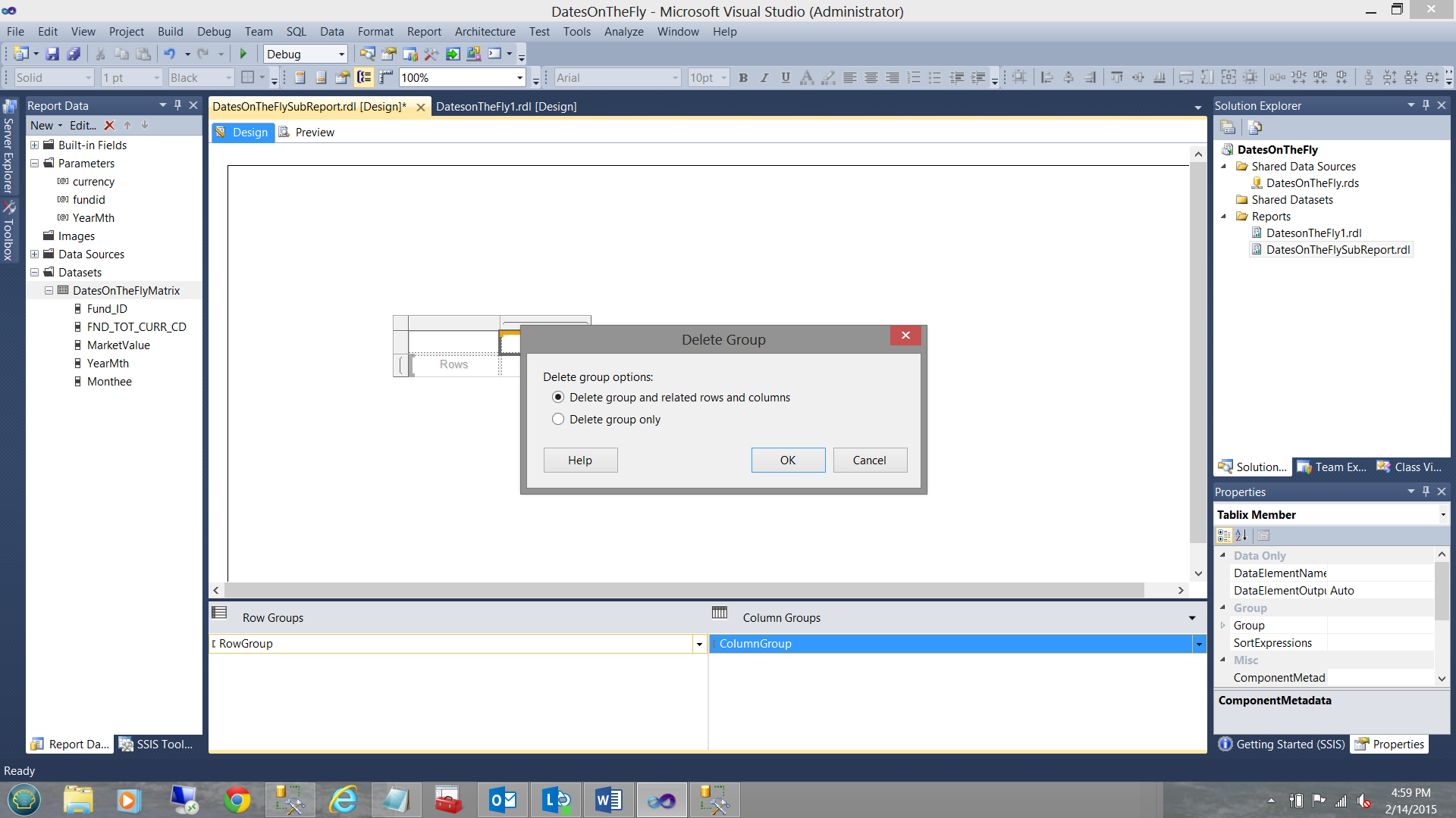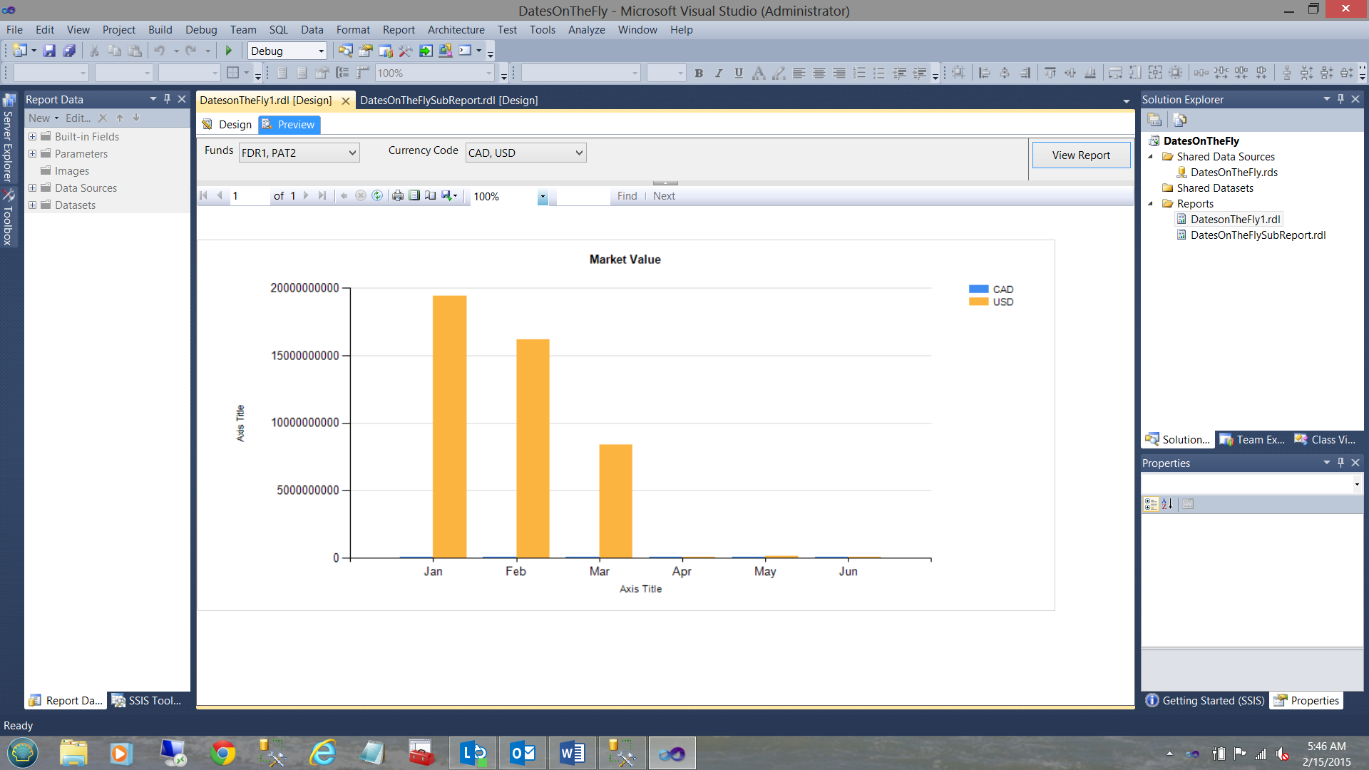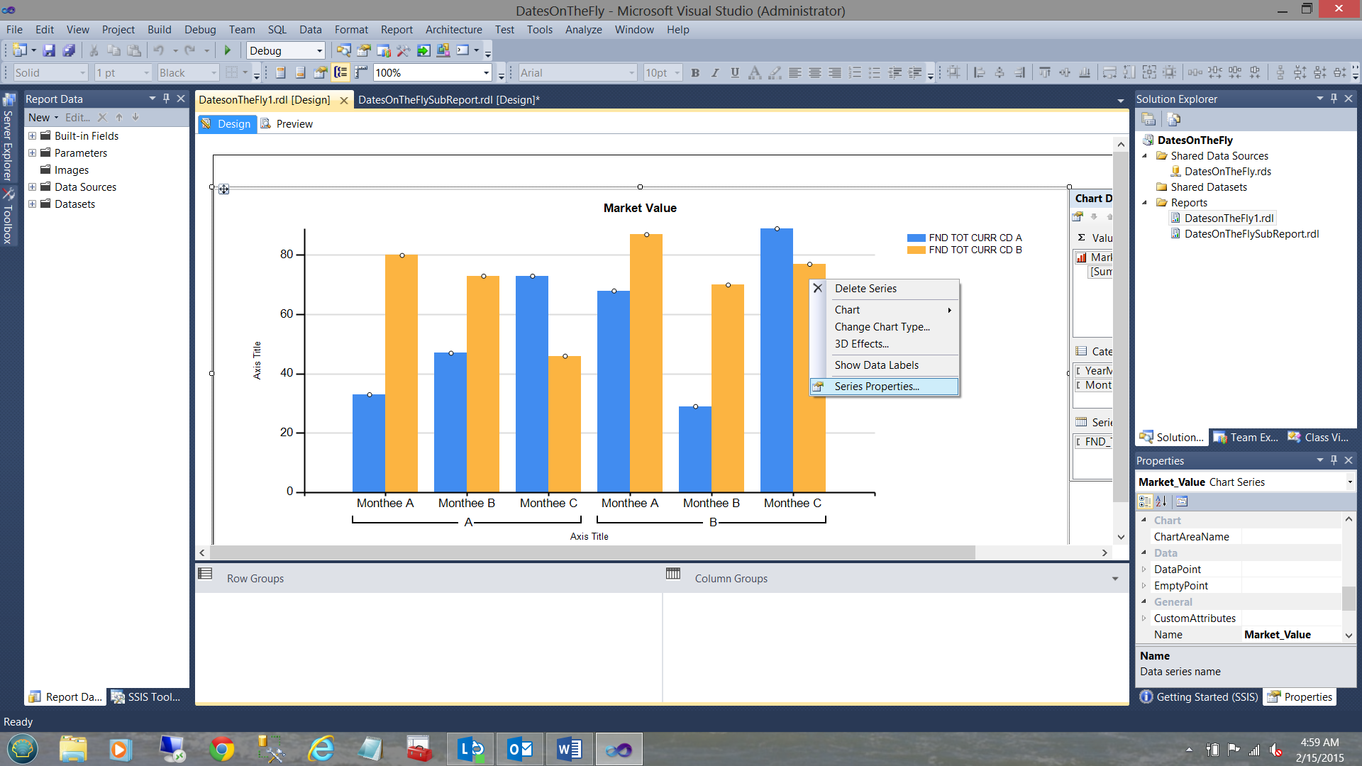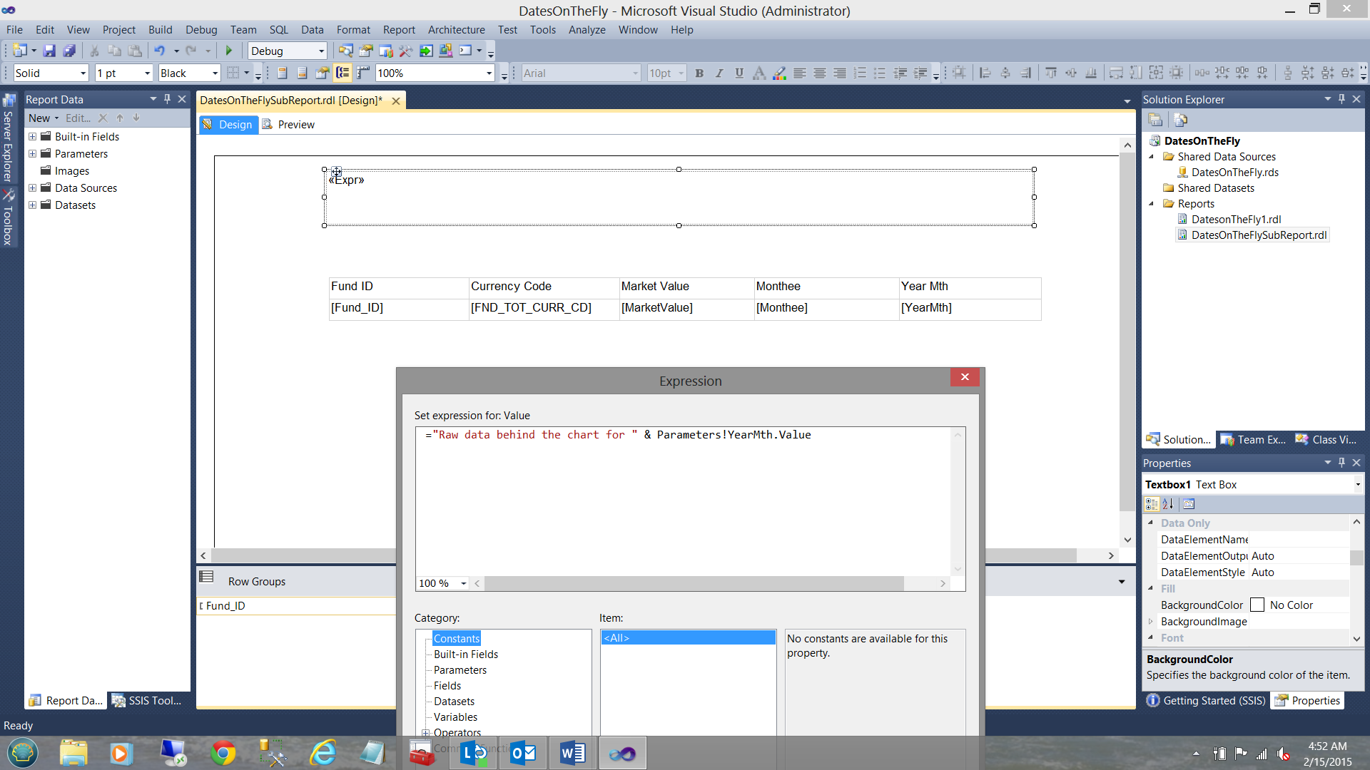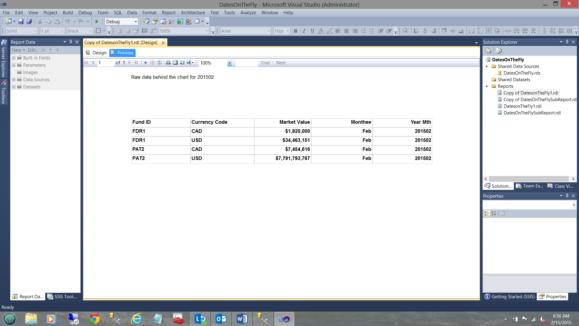 In today’s “get together” we are going to push our application a bit further and build in a subreport which will bring up the underlying data when the end user clicks upon the chart for any particular month. Thus should the user click on February 2015, then all of February’s data (for the selected funds) is shown in a matrix. If the user chooses March, then March’s data is shown.