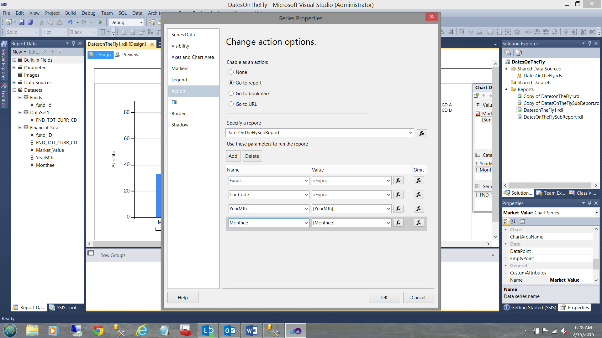 When the action tab opens we click the “Go to report” option and select the matrix based sub-report that we just created. Additionally we pass our three parameters “Funds”, “CurrCode” and the CHOSEN VALUE OF THE MONTH SELECTED generated by clicking on one of the vertical bars of the chart.