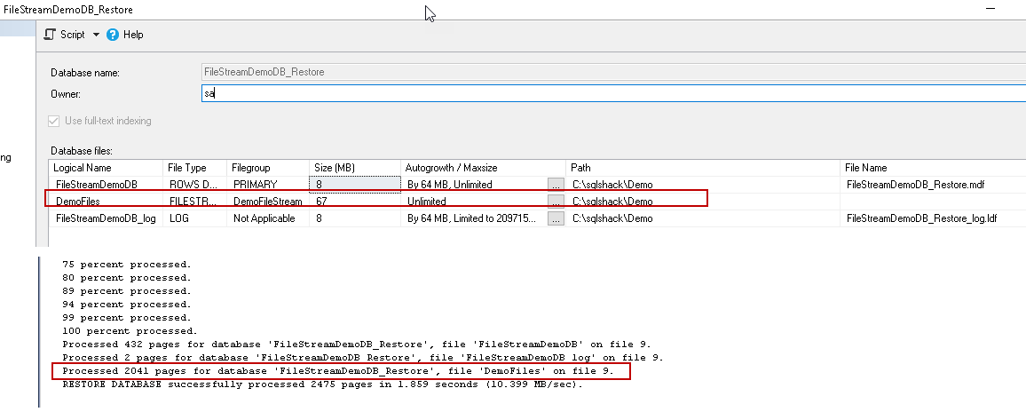 Processed 432 pages for database ‘FileStreamDemoDB_Restore’, file ‘FileStreamDemoDB’ on file 9.