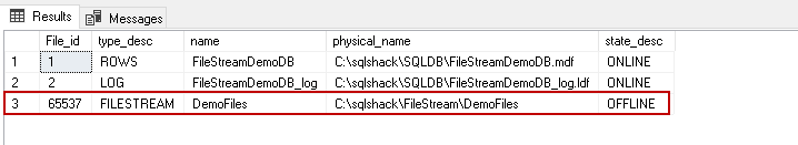 In the previous article, we performed the FILESTREAM filegroup backup as well. We can check the FILESTREAM database files and its status.